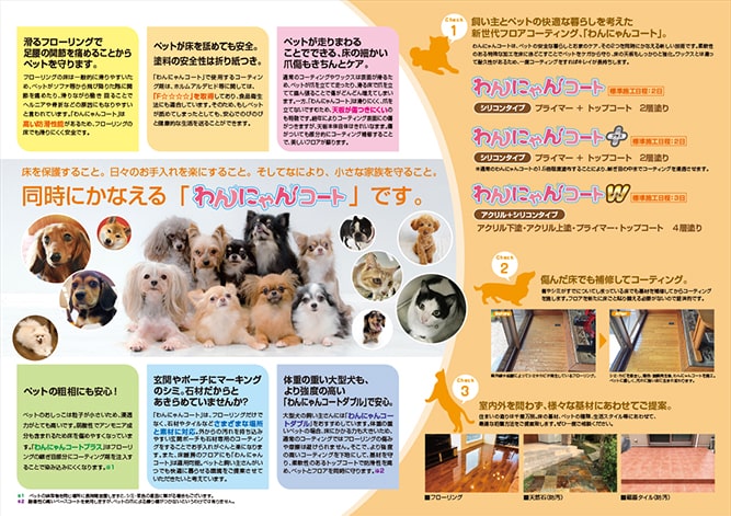 コーティングはそれ自体が有害物質を含まず、汚れを吸収しないので、健康生活が送れます。ワックスに吸収した汚れや、ダニの屍骸等が、削れたワックスとともに室内の空気を汚すことにより、アレルギーの原因になることもあります。また、コーティングは優れた抗菌・抗カビ性能を持ち、ペットの糞尿の汚れ等※ 1 にも対応出来ます。